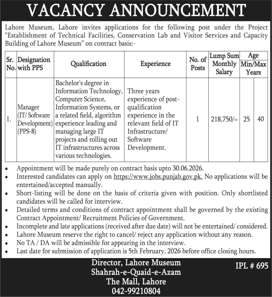 Explore the latest job opportunity at Lahore Museum for the position of IT/Software Development Manager. Apply now for this contract-based role with a competitive salary.
