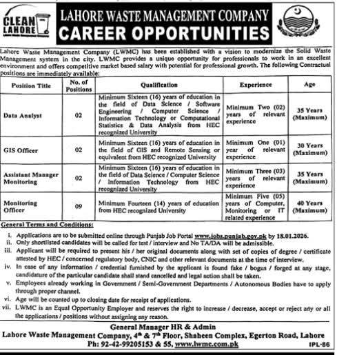 “Lahore Waste Management Company (LWMC) is hiring for multiple positions including Data Analyst, GIS Officer, Assistant Manager Monitoring, and Monitoring Officer. Apply for these roles to work on modernizing the city’s solid waste management system. Deadline to apply is 18th January 2026.”