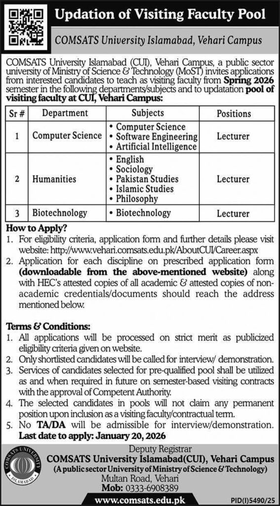 Available Visiting Faculty Positions – COMSATS University Islamabad (Vehari Campus)