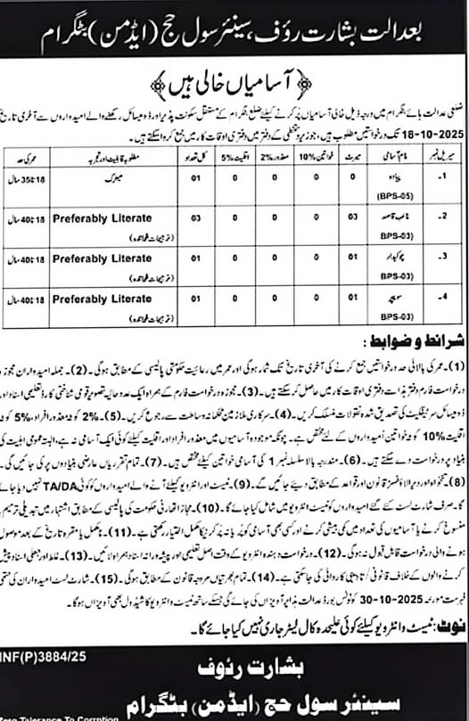 The Civil JUDGE Directorate (Admin), Battagram has announced multiple government job vacancies for the 2025. Applications are invited from eligible male and female candidates of Battagram district who meet the required criteria. These are temporary positions with fixed contracts up to October 18, 2025. All candidates must be preferably literate and fall within the age limit of 18 to 40 years. These posts fall under BPS-03 to BPS-05.