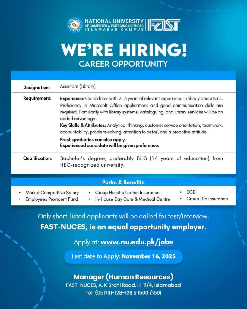 FAST-NUCES Islamabad is hiring a Library Assistant with 2–3 years of experience in library operations. Fresh graduates can also apply. Enjoy a competitive salary, insurance, provident fund, and medical benefits. Apply by November 16, 2025, at www.nu.edu.pk/jobs.