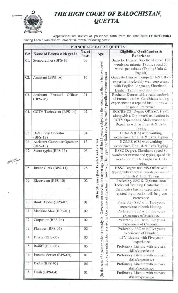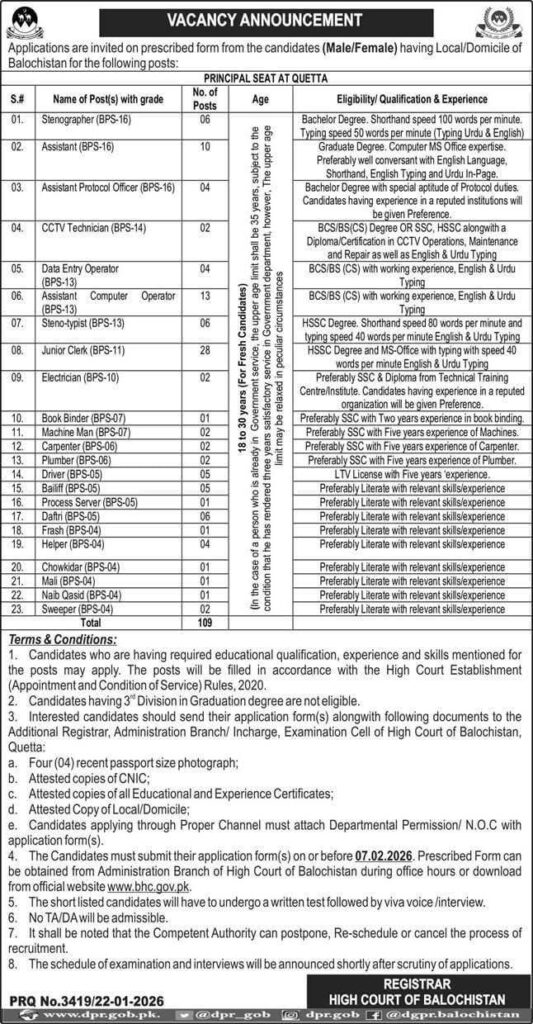 Explore job opportunities at the High Court of Balochistan with 109 available positions. Check qualifications, experience requirements, and application process for roles in stenography, administration, technical support, and more. Submit your application by February 7, 2026.