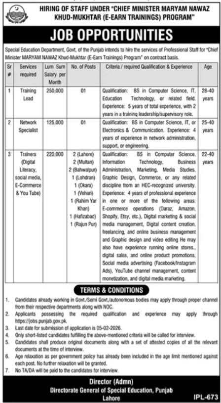 The Special Education Department, Punjab, invites applications for multiple positions under the Chief Minister Maryam Nawaz Khud-Mukhtar (E-Earn Trainings) Program. Positions include Training Lead, Network Specialist, and Trainers for Digital Literacy, E-Commerce, and YouTube. Apply by February 5, 2026, for these contract-based roles.