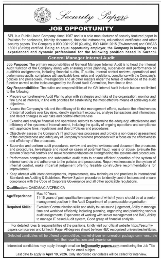 Apply for General Manager Internal Audit Job 2026 at Security Papers Limited Karachi. Explore audit leadership careers, CA/CMA eligibility, 15 years experience, and April deadline.