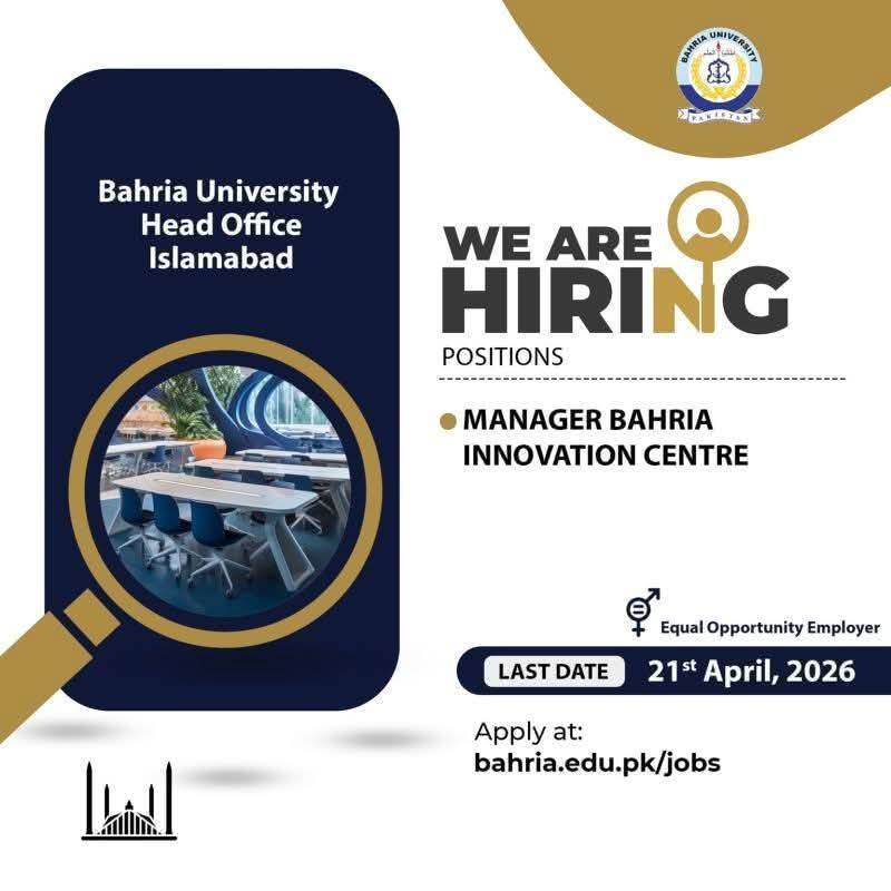 Apply for Bahria University Islamabad jobs 2026. Manager Innovation Centre position open with deadline 21 April 2026. Check eligibility, qualifications, and application details.