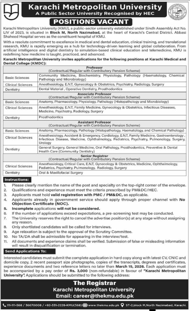 Karachi Metropolitan University invites applications for faculty positions in basic and clinical sciences, including Professors, Associate Professors, and Senior Registrars. Apply by March 15, 2026.