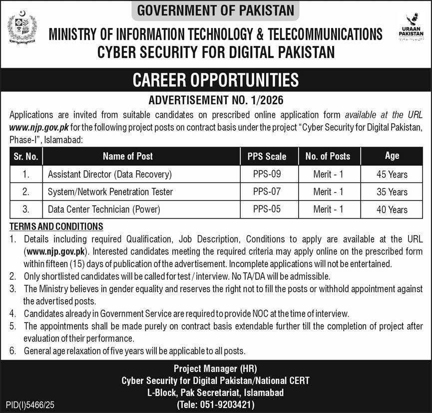 Explore latest Ministry of Information Technology Cyber Security Jobs 2026 in Islamabad. Contract-based government vacancies under Digital Pakistan project with competitive PPS scales, age relaxation, and merit-based selection.