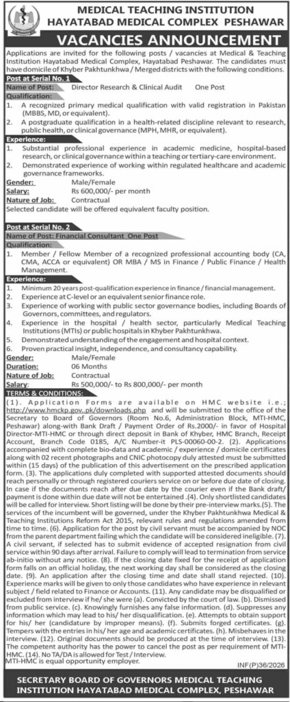 Apply for MTI Hayatabad Medical Complex Peshawar jobs 2026. Senior-level contractual vacancies announced for director research and financial consultant with high monthly salaries in Khyber Pakhtunkhwa.