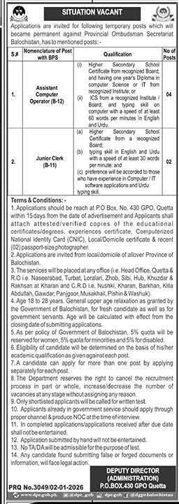 Apply for Provincial Ombudsman Secretariat Balochistan jobs 2026. Temporary government vacancies announced for assistant computer operator and junior clerk with quota-based selection.