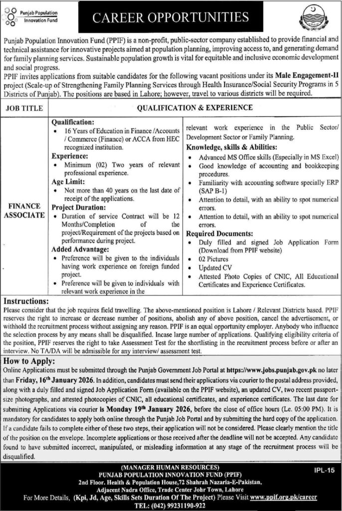 Explore latest Punjab Population Innovation Fund PPIF jobs 2026. Finance Associate vacancy under public sector development project in Lahore with contract-based hiring, field exposure, and accounting-focused role.