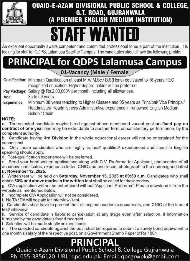 Apply now for Principal Jobs in Punjab 2025 at Quaid-e-Azam Divisional Public School & College Gujranwala (QDPS). Exciting career opportunity for qualified and experienced educators. Attractive salary package up to Rs. 200,000/month. Apply before 12th November 2025