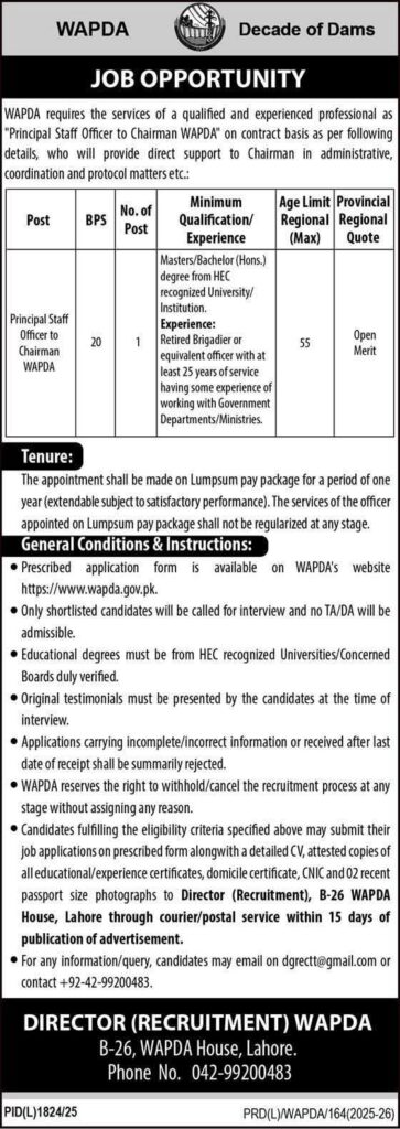 | Principal Staff Officer to Chairman WAPDA | 20 | 01 | Bachelor’s / Master’s (Hons.) from HEC recognized institution | Retired Brigadier or equivalent with 25+ years service and govt. coordination experience | Up to 55 Years | Open Merit |