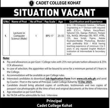 Apply for Lecturer in Computer Science at Cadet College Kohat 2025. Check qualifications, experience, pay scale, and application details for the BPS-17 vacancy. Last date to apply: 15 December 2025.