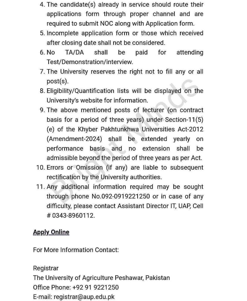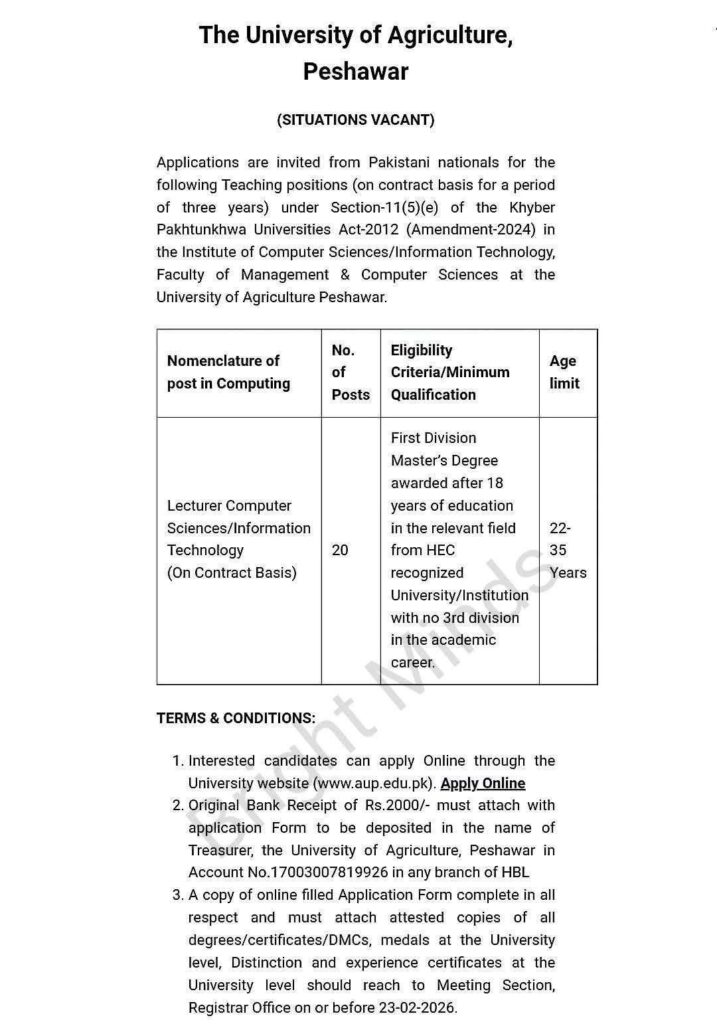 The University of Agriculture Peshawar is hiring for 20 Lecturer positions in Computer Science/Information Technology. Apply online by February 23, 2026. Check eligibility, application instructions, and more details below.