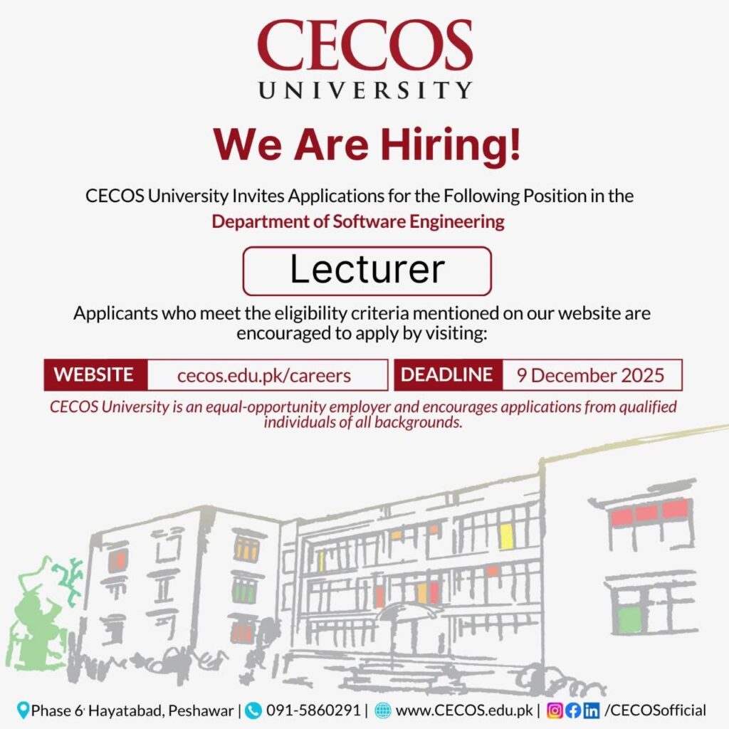 CECOS University Peshawar is hiring a Lecturer for the Software Engineering Department. Apply by 9th December 2025 if you meet the eligibility criteria. Visit the website to submit your application.