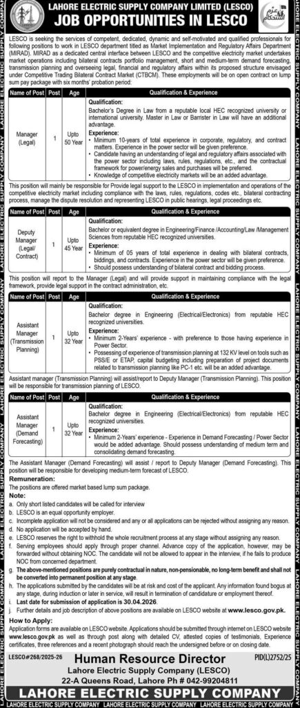 LESCO Jobs 2026 Lahore – Legal, Engineering & Demand Forecasting Vacancies (Govt Jobs Pakistan)