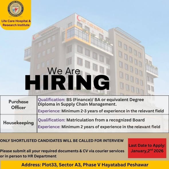 Latest job openings at Life Care Hospital & Research Institute Peshawar 2026. Apply for Purchase Officer and Housekeeping staff positions with required qualifications and experience. Walk-in and courier applications accepted.