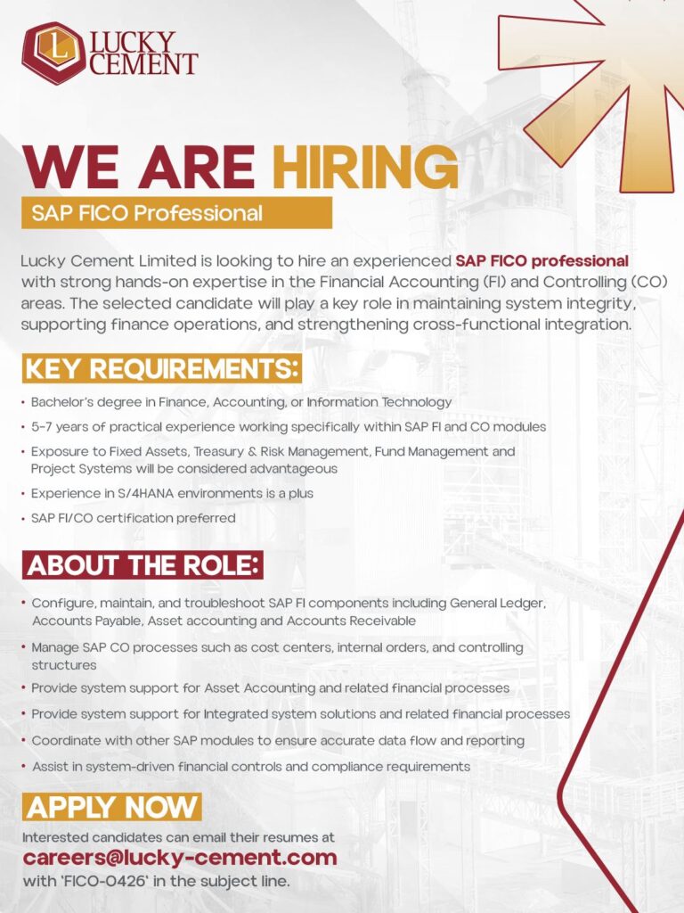 Join Lucky Cement Limited as an SAP FICO Professional. Seeking candidates with 5-7 years of experience in SAP FI/CO modules. Apply now with code FICO-0426 via email.