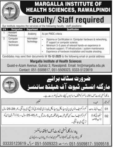 “Margalla Institute of Health Sciences, Rawalpindi is hiring faculty and staff for positions in Anatomy and Information Technology. Apply by 15th December 2025 for exciting career opportunities in the healthcare and IT sectors.”