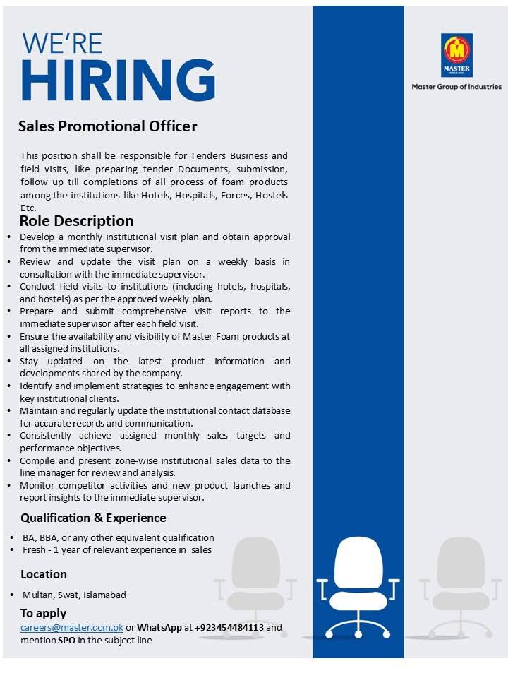 Apply now for Master Group of Industries Jobs 2025 as Sales Promotional Officer in Islamabad, Multan & Swat. Fresh graduates and sales professionals can apply today.