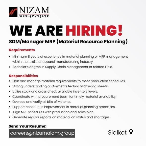 “Apply for SDM/Manager MRP jobs in Sialkot with Nizam Sons Pvt Ltd. Ideal for professionals with 8+ years of material planning or MRP experience in the textile and apparel industry. Competitive role, strong growth potential. Send your resume today.”