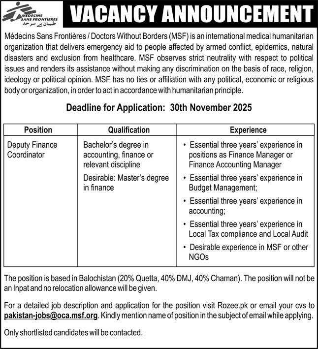 MSF (Doctors Without Borders) is hiring a Deputy Finance Coordinator for Balochistan. Requires 3 years essential experience in accounting/audit. Apply by November 30, 2025.