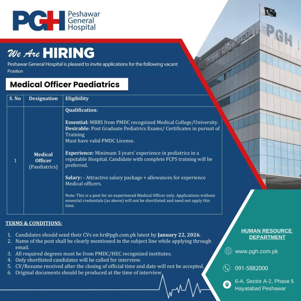 Apply for Medical Officer Paediatrics jobs at Peshawar General Hospital. MBBS doctors with pediatrics experience and valid PMDC license are invited. Attractive salary package. Last date: 22 January 2026.