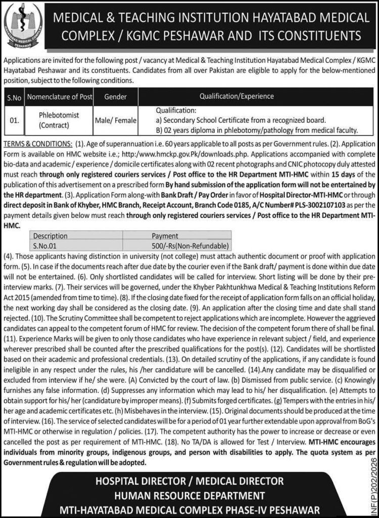 MTI Hayatabad Medical Complex Peshawar Jobs 2026 announced for Phlebotomist (Contract). Check qualification, experience, application fee, eligibility, and deadline details.