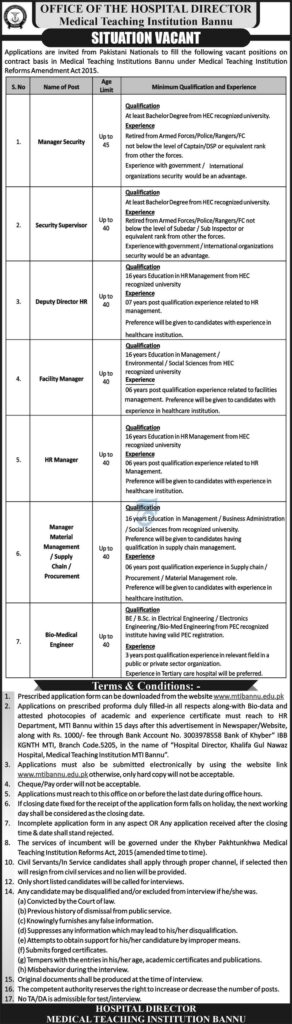 MTI Bannu is hiring 7 specialized posts: Manager Security, HR, Facility, and Bio-Medical Engineer. Apply via website/hard copy by November 30, 2025.