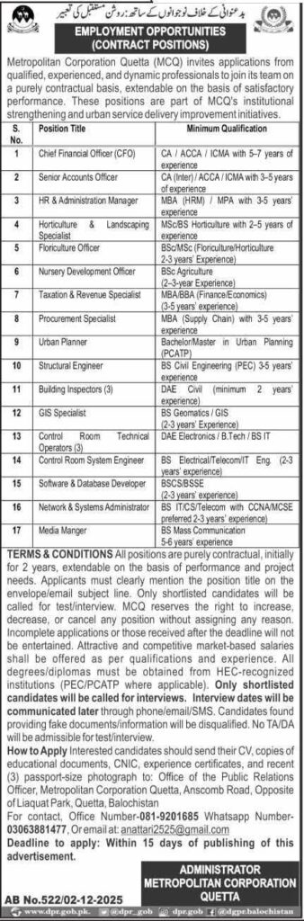 “Apply for contract positions at Metropolitan Corporation Quetta (MCQ). Positions include CFO, Urban Planner, HR & Admin Manager, and more. Deadline: 15 days after posting.”