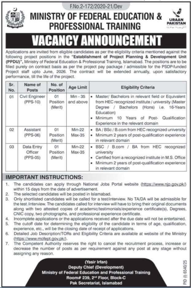 Apply for Ministry of Federal Education & Professional Training Jobs 2026 under PPDU project. Check Civil Engineer PPS-10, Assistant PPS-06, Data Entry Officer PPS-05 eligibility, age limit, experience, and application deadline.