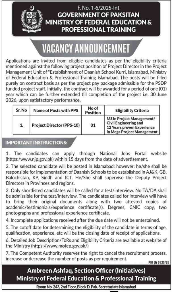 “The Ministry of Federal Education & Professional Training is hiring a Project Director for the Daanish School Kurri project in Islamabad. Apply for the Project Director (PPS-10) position, requiring an MS in Project Management/Civil Engineering and 12 years of mega project management experience. Apply now before the deadline.”