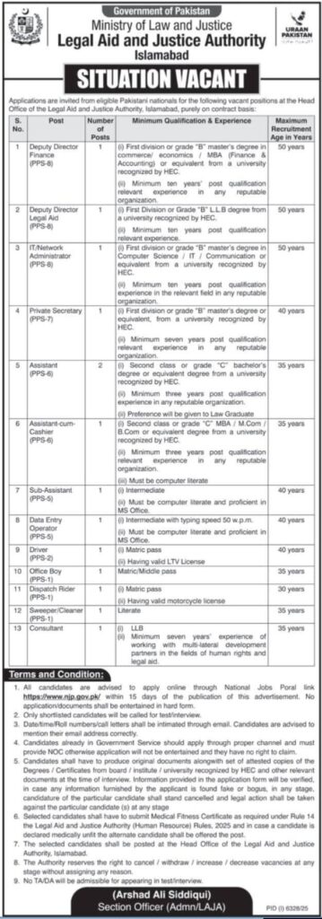 The Ministry of Law and Justice is hiring for multiple contract-based positions at the Legal Aid and Justice Authority in Islamabad. Positions include Deputy Director, IT Administrator, Legal Consultant, and more. Apply by 15th February 2026.