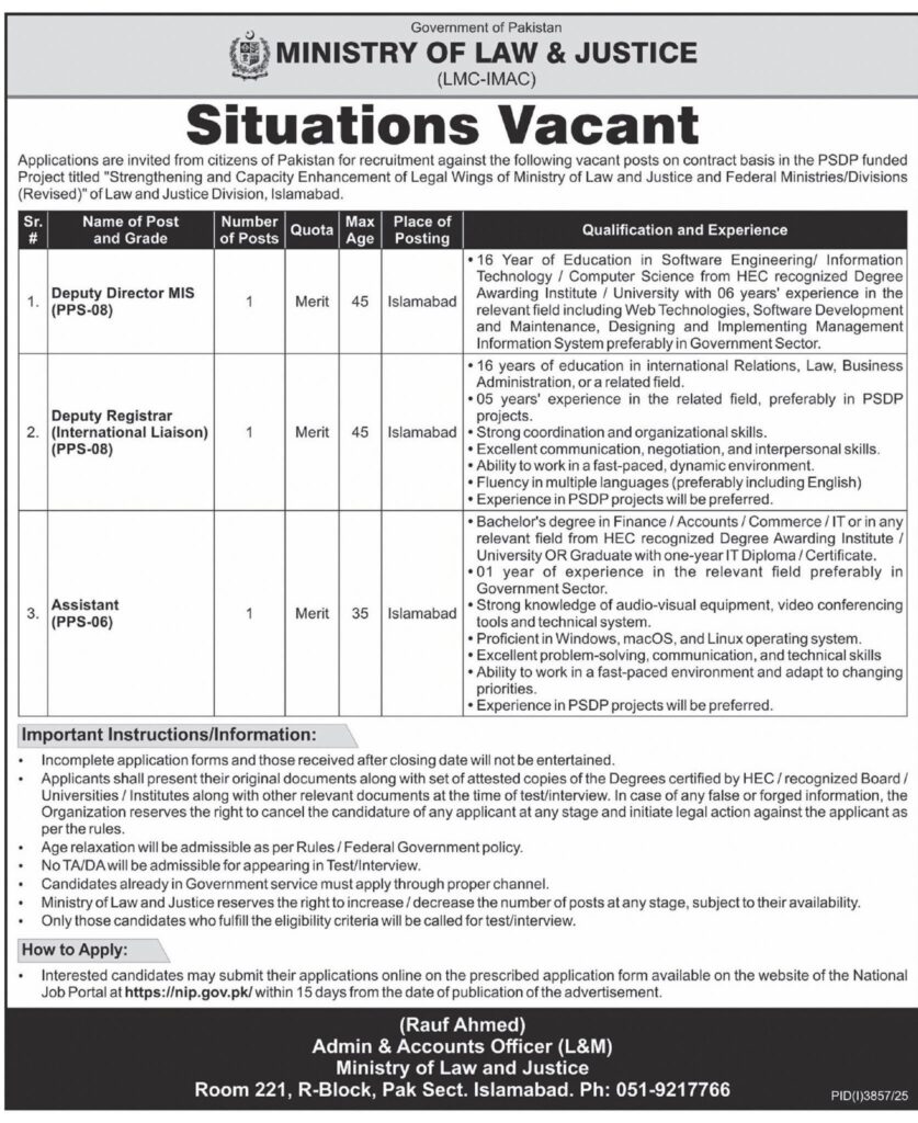 Ministry of Law and Justice (LMC-IMAC), Islamabad, is hiring for its PSDP Project. Vacancies: Deputy Director MIS/IT, Deputy Registrar (International Liaison), and Assistant. Requires 16 years education in Software Engineering, International Law/Relations, or Finance/IT. Max age 45. Apply via National Job Portal within 15 days.