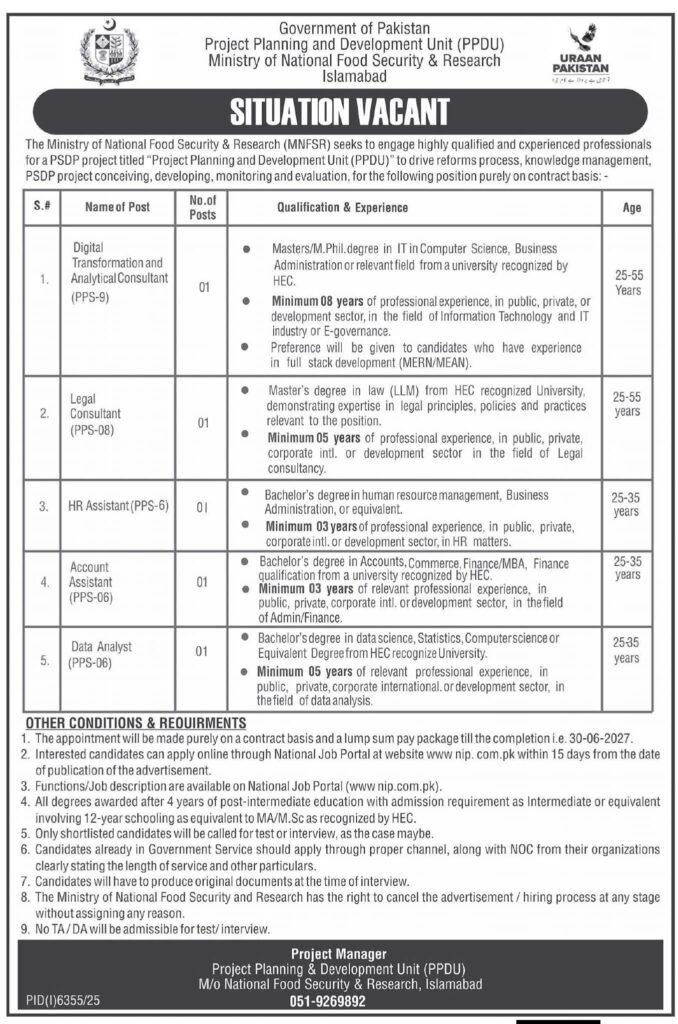 The Ministry of National Food Security & Research (MNFSR) invites applications for various positions in Islamabad, including Digital Transformation Consultant, Legal Consultant, HR Assistant, Account Assistant, and Data Analyst. Apply by 20th February 2026 for these contract-based roles.