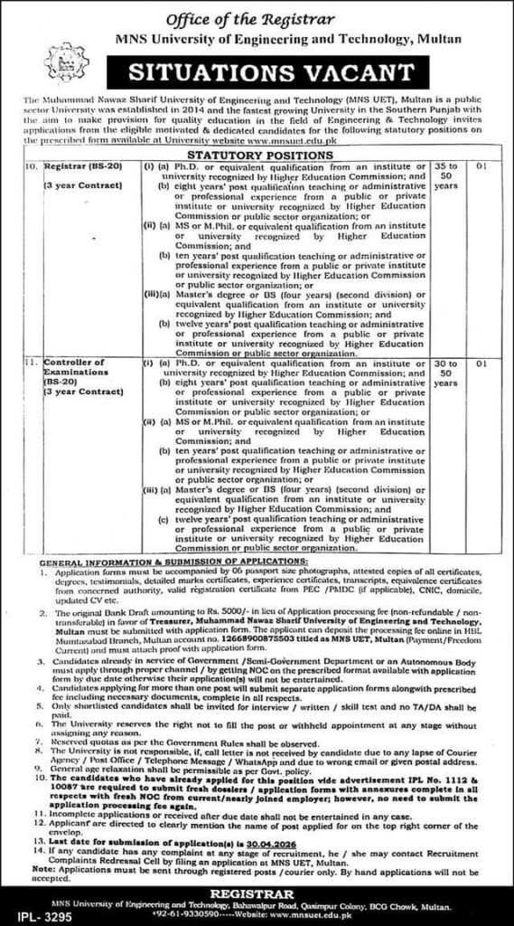 Apply for MNS UET Multan Jobs 2026. Registrar and Controller of Examinations vacancies available. Check qualifications, experience, eligibility, application process, and deadline.