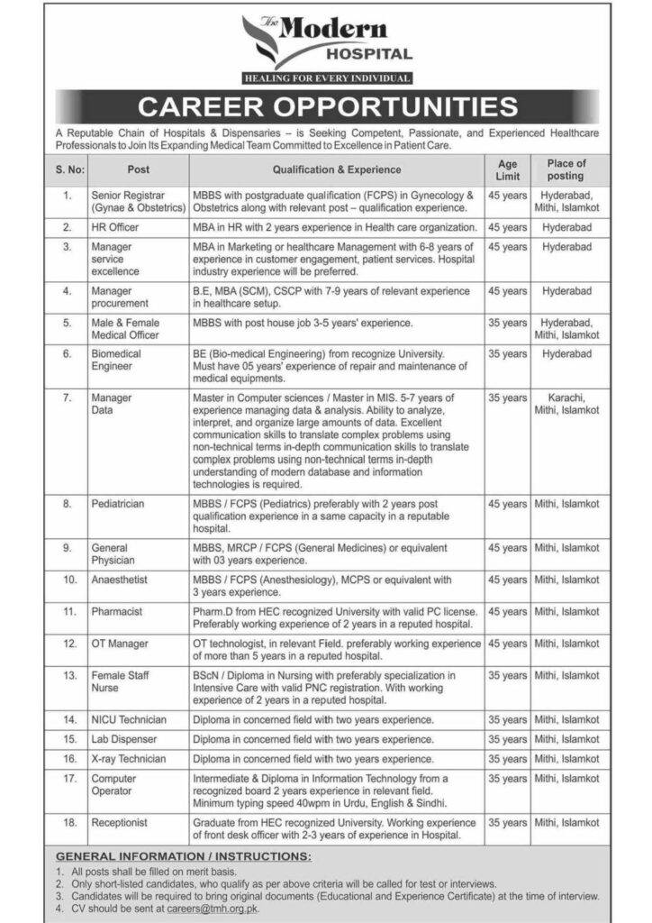 | 11 | Pharmacist | Pharm.D from HEC recognized University with valid PC license, 2 years hospital experience. | 45 years | Mithi, Islampur |