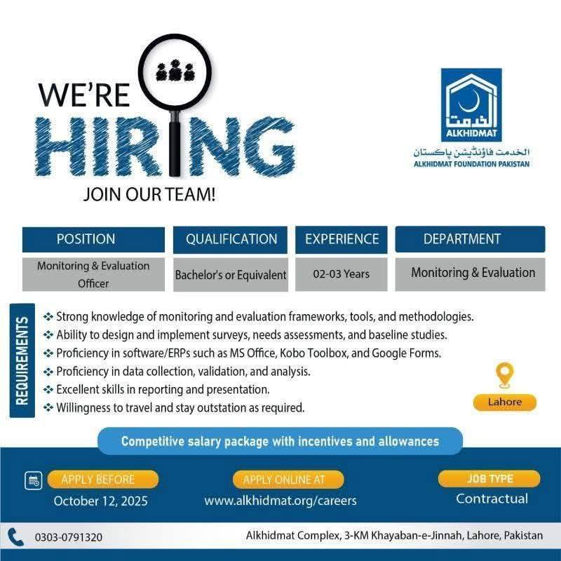 Join Alkhidmat Foundation as a Monitoring & Evaluation Officer in Lahore. If you have a Bachelor’s degree and 2-3 years of experience in M&E, apply now for this exciting opportunity. Competitive salary package with incentives. Deadline: October 12, 2025.
