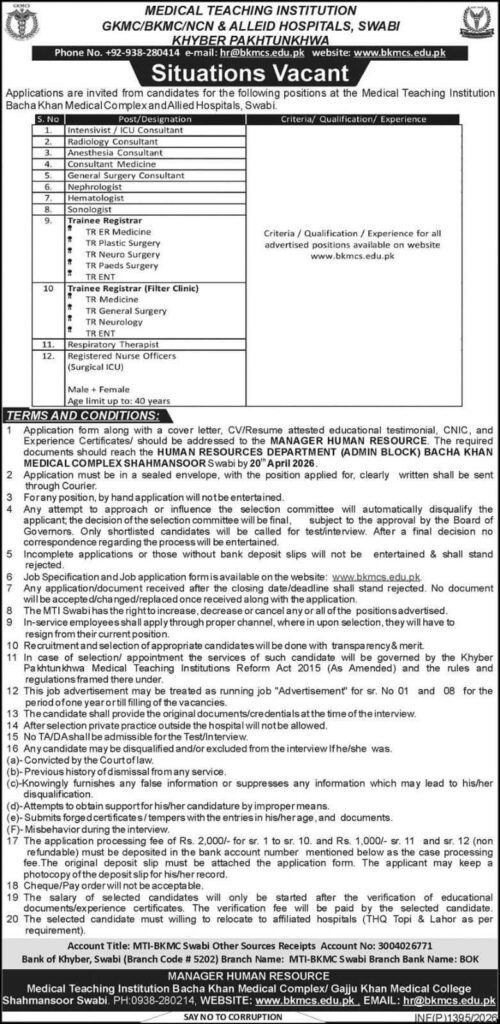 Apply for MTI BKMC Swabi jobs 2026 in Khyber Pakhtunkhwa. Multiple consultant, trainee registrar, nursing, and therapist positions. Check eligibility, deadline, and application process.