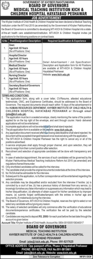“The Board of Governors at MTI-KICH & Children Hospital Peshawar invites applications for key leadership positions, including Dean, Hospital Director, Medical Director, Nursing Director, and Secretary Board of Governors. Apply now for these prestigious contract-based roles. Deadline: 15th January 2026.”