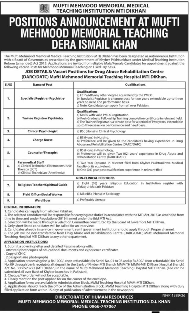 Apply for MTI DI Khan jobs 2026 at Mufti Mehmood Memorial Hospital. Psychiatry, nursing, psychologist, and paramedical posts available. Check eligibility and deadline.