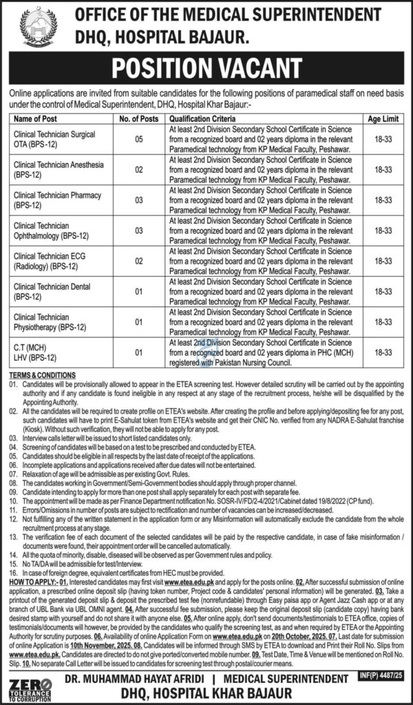 DHQ Hospital Bajaur is hiring clinical technicians for various positions, including Surgical OTA, Anesthesia, Pharmacy, and more. Applicants must meet the qualification criteria and apply online by 10th November 2025.