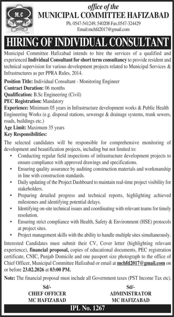 Municipal Committee Hafizabad is hiring an Individual Consultant – Monitoring Engineer for a 6-month contract. The role requires B.Sc. in Civil Engineering, 5 years of relevant experience, and PEC registration. Apply by 23rd February 2026.