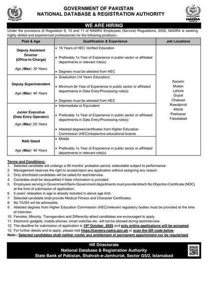 Explore exciting job opportunities with NADRA in Pakistan! We are hiring for multiple positions such as Deputy Assistant Director, Junior Executive, and Naib Qasid. Join a dynamic team with great career growth prospects and work in various cities including Karachi, Islamabad, Lahore, and more. Apply by October 19, 2025.