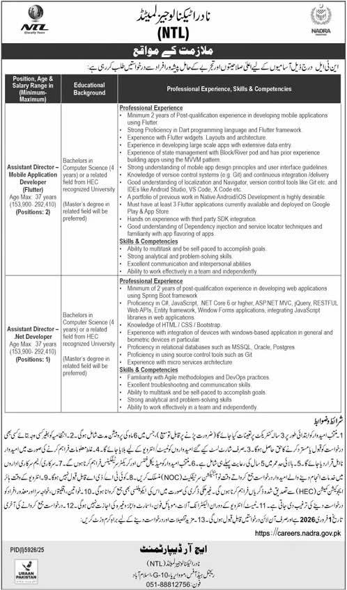 Explore job openings at NADRA for the position of Assistant Director – Mobile Application Developer (Flutter) and Net Developer. Minimum qualifications and experience requirements include a Bachelor’s degree in Computer Science or related fields, along with 2+ years of post-qualification experience. Apply by the deadline for a rewarding career in technology development at NADRA.