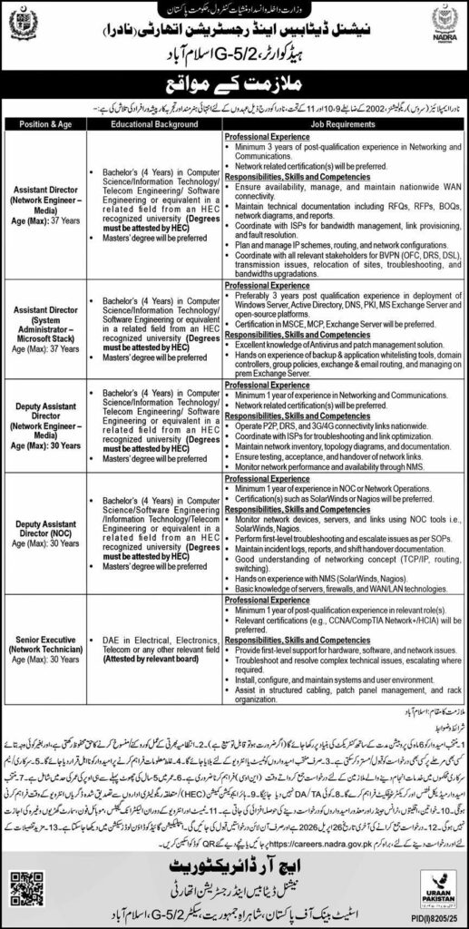 NADRA Jobs 2026 Islamabad – Network Engineer, System Administrator & NOC Roles (Govt IT Jobs Pakistan)