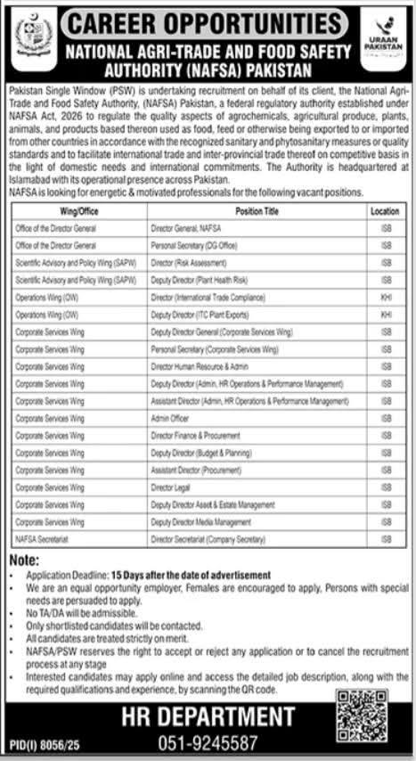 | Director General (NAFSA) | Relevant Master’s degree in agriculture, food safety, or related field | Extensive senior-level experience | Not specified |
