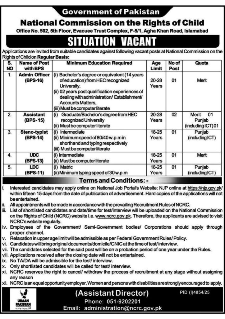 Explore job opportunities at the National Commission on the Rights of Child, Islamabad. Vacancies include Admin Officer, Assistant, Steno-typist, UDC, and LDC with competitive pay. Apply online through the National Job Portal.
