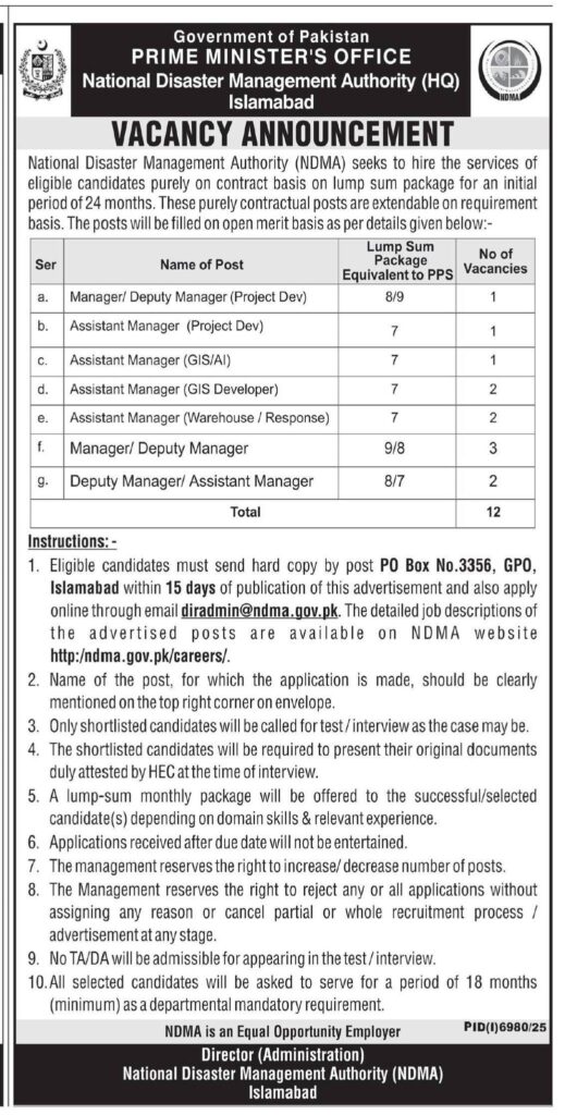 Apply for NDMA Islamabad contract jobs 2026 under Prime Minister’s Office. 12 vacancies for Managers and Assistant Managers (Project Development, GIS, Warehouse/Response). Check eligibility, package details, and application process.