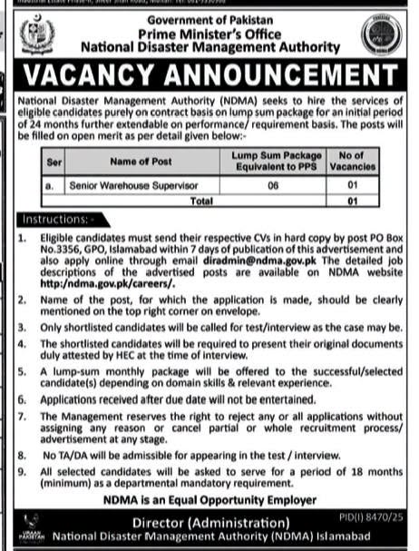 Apply for NDMA Jobs 2026 in Islamabad. Senior Warehouse Supervisor vacancy with PPS-06 salary. Check eligibility, application process, and deadline details.